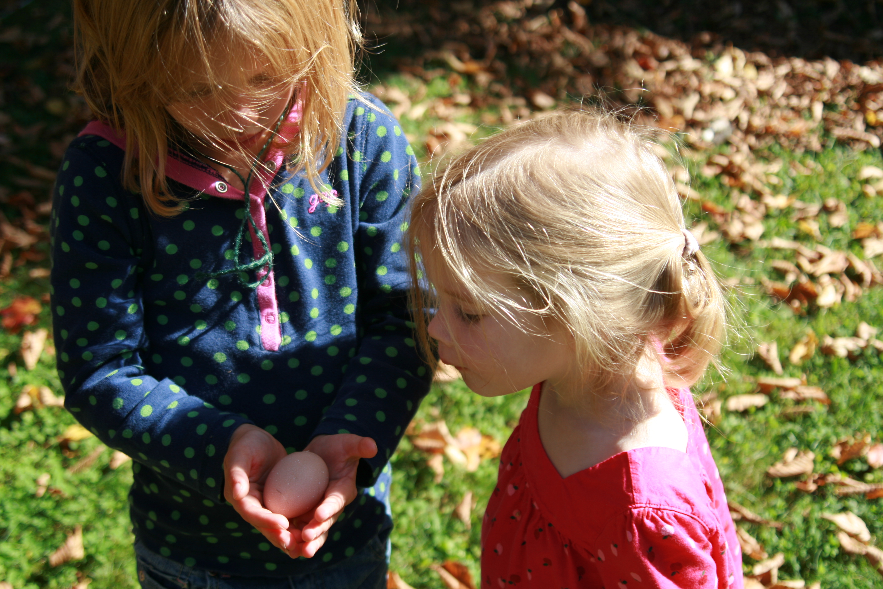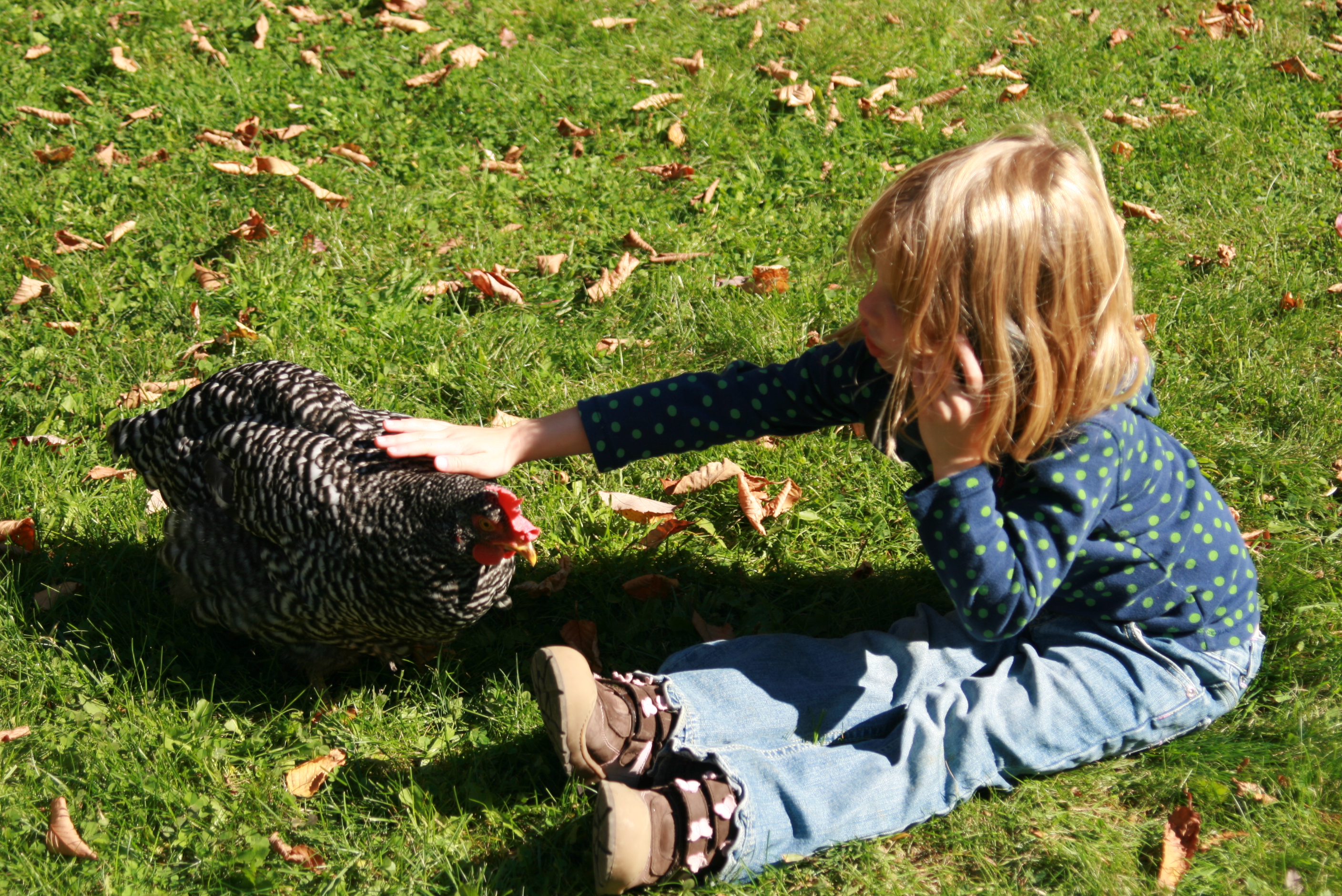 All of our recent visitors were very interested in seeing the chickens. Of course, Grace was more than happy to show them off. The chickens seem to really like her, and they often approach her when she walks outside. They also willingly (at least sometimes) let her pick them up, and they are still and quiet while she holds them and talks to him. This kid really does seem to have a special bond with animals — I will not be at all surprised if she actually becomes an "animal rescuer," as she so firmly believes she will.