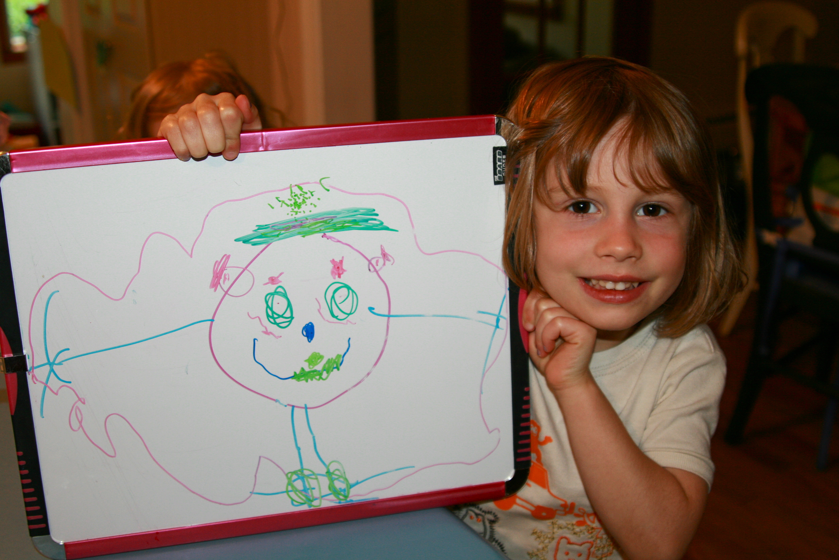 This morning while I was cooking breakfast, Grace entertained herself by drawing pictures on a dry erase board. Her first masterpiece was a drawing of me, and she kept asking me to turn around so she could take a good look at her subject matter. She wanted to be sure to include everything: eyebrows, feet, teeth, ears.. and wrinkles. As she proudly showed me her artwork, she said: "Look Mommy, I drew everything – even the little lines around your eyes when you're smiling." Great – I don't have a body, just a huge head and wrinkles. At least she didn't give me gray hair…